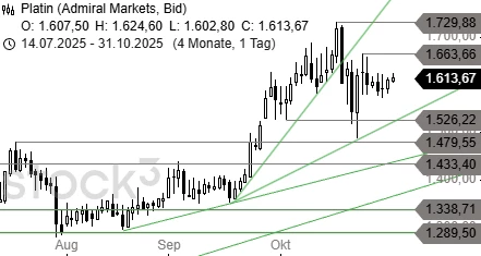 Bei Platin wird aktuell an einem weiteren Ausbruchsversuch über den Widerstand bei 1.663 USD gearbeitet. Sollte dieser gelingen, könnte die steile Aufwärtsbewegung der Vorwoche bis ans Rallyhoch bei 1.729 USD führen.