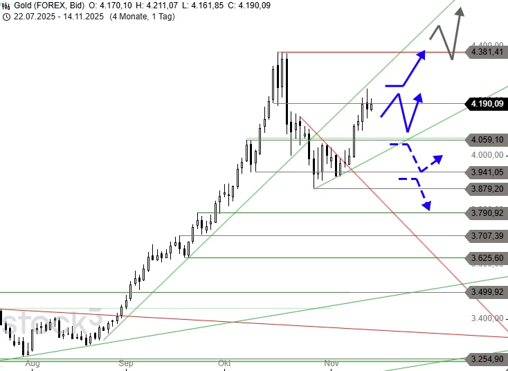Mit dem erfolgreichen Anstieg über den Widerstand bei 4.192 USD wurde am Mittwoch der Abverkauf seit dem frischen Rekordhoch bei 4.381 USD neutralisiert. Die Gegenbewegung seit dem Oktober-Tief bei 3.879 USD hatte zuvor eine kurze Seitwärtskonsolidierung mit dem Ausbruch über 4.059 USD nach oben verlassen und damit den Grundstein für eine impulsive Erholungsphase gelegt. Die Grenzen zu einer regulären Erholung im intakten Abwärtstrend wurden bereits mit dem Anstieg über 4.100 USD überschritten und jetzt sogar schon das kurzfristige Kursziel bei 4.230 USD erreicht.