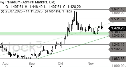 Der erste Versuch, sich über den Widerstand bei 1.475 USD zu arbeiten, wurde knapp vor der 1.500-USD-Marke gestoppt. Allerdings könnte Palladium ausgehend von 1.383 USD jetzt zu einer zweiten Kaufwelle ansetzen. Kurse unter 1.343 USD würden dagegen die Bären auf den Plan rufen.
