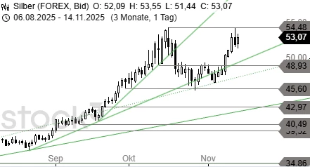 Mit dem Anstieg auf 4.244 USD besteht jetzt die Chance, dass der Aufwärtsschub seit Anfang November Teil eines neuen Aufwärtstrends ist. Dieser könnte oberhalb von 4.256 USD direkt an das Rekordhoch bei 4.381 USD führen. Ein Sprung über die Marke dürfte schwer werden, kann allerdings später für eine Rally bis 4.460 USD und 4.540 USD sorgen. Abgaben unter das aktuelle Wochentief bei 4.137 USD würden dagegen für den Start einer Zwischenkorrektur sprechen, die bei 4.095 USD von den Käufern aufgefangen werden kann. Ein Einbruch unter 4.046 USD würde die Erholung dagegen stoppen.