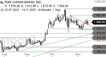 Mit dem Anstieg über die Abwärtstrendlinie hat Platin den ersten Schritt zu einem Angriff auf das Rallyhoch bei 1.729 USD getan. Jetzt muss der Widerstand bei 1.626 USD aus dem Weg geräumt werden. Oberhalb von 1.570 USD ist diese Chance aktiv.