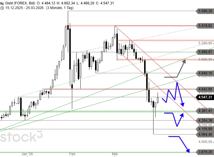 Mit dem Bruch der Unterstützung bei 4.993 USD setzte Mitte März eine weitere massive Verkaufswelle ein, die den Goldpreis wie erwartet unter die Supportmarken bei 4.840 USD und 4.642 USD einbrechen ließ. Dieser Kurssturz kulminierte am vergangenen Montag in einem crash-artigen Abverkauf und erreichte in der Spitze 4.094 USD. Auf Höhe des Projektionsziels bei 4.120 USD setzte allerdings noch am Montag die avisierte steile Erholung ein, die Gold wieder über 4.381 USD antrieb und damit an die Unterseite des früheren Abwärtstrendkanals bei rund 4.600 USD klettern ließ.