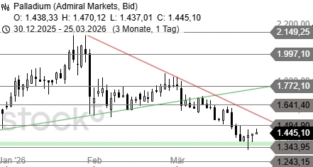 Palladium hat den Support bei 1.343 USD verteidigt und steuert auf den Widerstand bei 1.494 USD zu. Hier könnte ein weiterer Kursrutsch folgen. Bei einem Sprung über die Marke wäre dagegen eine Kaufwelle bis 1.570 USD wahrscheinlich.