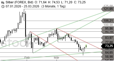 Silber hat am Montag eine Erholung gestartet, die jetzt den Widerstand bei 74,53 USD erreicht. Darüber wäre ein Anstieg bis 77,88 USD möglich. Ein Rückfall unter 69,55 USD würde die Erholung dagegen stoppen.