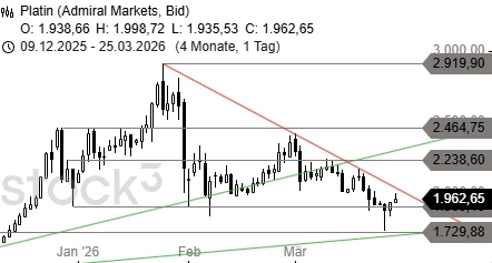 Platin attackiert die übergeordnete Abwärtstrendlinie auf Höhe von 2.015 USD. Über der Diagonale stünde eine Erholung bis 2.238 USD an. Scheitern die Bullen dagegen an der Abwärtstrendlinie, dürfte nach einer Korrektur bis 1.909 USD ein zweiter Ausbruchsversuch folgen.