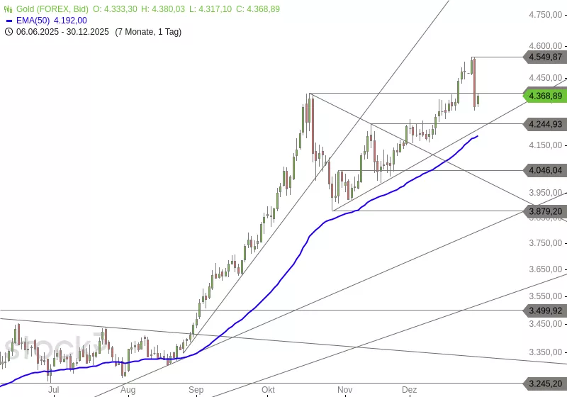 Der Goldpreis brach in den Vorwochen aus einer Konsolidierungsphase nach oben aus und konnte sich in der vergangenen Woche auch über die frühere Widerstandsmarke bei 4.381 USD hinaus auf ein neues Hoch schieben. Zum Wochenbeginn setzte ein Pullback ein, der direkt unter diese ehemalige Ausbruchszone führte, die mittelfristige Rallye jedoch bislang nicht gefährdet. Solange sich Gold oberhalb der Unterstützung bei 4.245 USD behaupten kann, bleibt die Chance auf ein erneutes Aufwärtsdrehen bestehen.