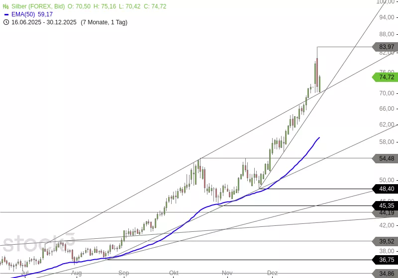 Silber löste sich Ende November aus einer Konsolidierungszone nach oben. Mit dem Anstieg über die Marke von 54,50 USD wurde ein Vollkaufssignal aktiviert, das die Notierungen auch aus dem mittelfristigen Aufwärtstrendkanal nach oben herausführte. In der Folge setzte sich die Rallye dynamisch fort und führte den Silberpreis im Hoch bis in den Bereich von 84,00 USD. Zu Wochenbeginn kam es anschließend zu einem deutlicheren Pullback.