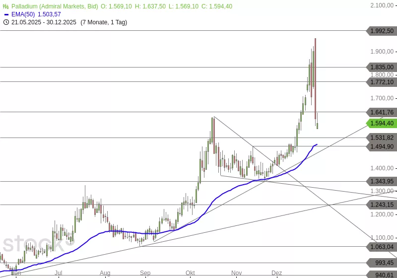 Nach dem Ausbruch aus einer Konsolidierungsphase verschärfte sich der Anstieg bei Palladium ab Mitte Dezember deutlich und führte den Kurs fast bis an die Widerstandszone um 2.000 USD. Ausgehend von diesem Bereich setzte zum Wochenstart eine sehr steile Abwärtsbewegung ein, wodurch die Volatilität nochmals spürbar zunahm. Erste Unterstützungen finden sich nun im Bereich zwischen 1.494 USD und 1.531 USD.