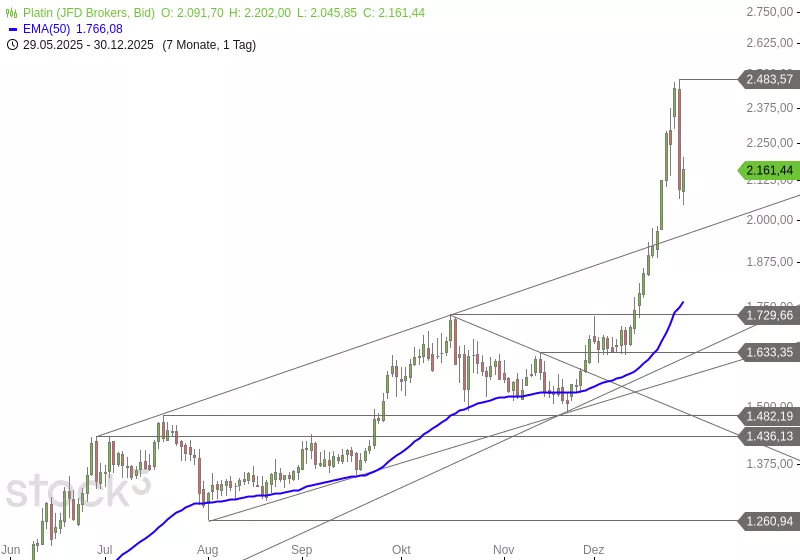 Platin brach Mitte Dezember aus einer Konsolidierungsphase nach oben aus und erreichte ein neues Hoch. Die zunehmend steile Aufwärtsbewegung führte den Kurs auch über die Oberkante des Aufwärtstrendkanals der Vormonate hinaus und bis an das Hoch bei 2.484 USD. Zum Wochenstart setzte jedoch ein Pullback ein, der Platin deutlich zurückführte. Erste Unterstützung bietet nun die ehemalige Trendkanaloberkante im Bereich von rund 1.960 USD.