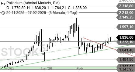 Palladium setzt die Erholung fort und erreicht den Widerstand bei 1.847 USD. Über der Marke könnte der Anstieg direkt bis 1.900 USD und ggf. bis 1.997 USD führen. Eine Zwischenkorrektur bis 1.772 USD würde die Chancen der Bullen nicht schmälern.