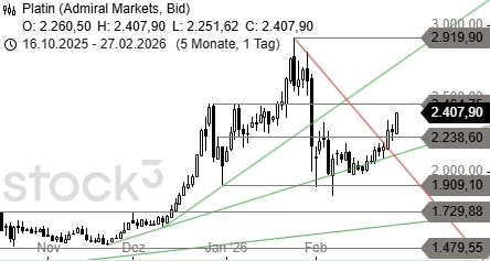 Im frühen Handel kommt heute Schwung in den Platinkurs, der direkt den Widerstand bei 2.464 USD anvisiert. Ein Ausbruch über die Marke könnte für eine Erholungsrally bis 2.650 USD sorgen.