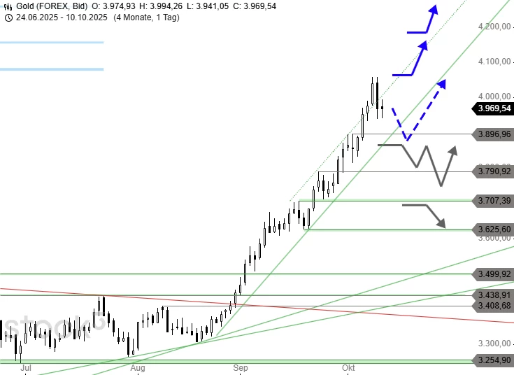 Nachdem der Goldpreis über das vorherige Rekordhoch bei 3.896 USD ausgebrochen war, beschleunigte sich die Rally erneut und führte an den Kurszielbereich bei 4.070 USD. Mit 4.059 USD wurde am Mittwoch ein vorerst finales Allzeithoch markiert, denn im gestrigen Handel verabschiedete sich der Kurs des Edelmetalls in eine dynamische Korrektur, die direkt unter die Oberseite des bisherigen, steilen Trendkanals und an den Support um 3.970 USD führte. Bislang hat die Entscheidungsmarke bei 4.070 USD also ihre volle Wirkung entfalten können.