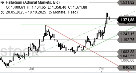 Die Palladium-Rally erreichte gestern fast 1.500 USD, ehe eine enorme Korrektur für einen Einbruch auf 1.383 USD sorgte. Die Marke wurde im frühen Handel ebenfalls unterschritten. Jetzt sollte bei 1.343 USD eine Erholung starten, um weitere Abgaben bis 1.292 USD zu verhindern.