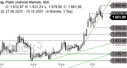 Gestern überwand Platin kurz die Hürde bei 1.660 USD, setzte von einem Rallyhoch bei 1.686 USD allerdings unter den Support bei 1.626 USD zurück und könnte die Korrektur jetzt bis 1.526 USD ausdehnen. Ein Anstieg über 1.645 USD wäre bullisch zu werten.
