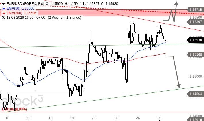 EUR/CAD hat sich nach dem Tief vom 09. März bei 1,5611 CAD deutlich erholt und notiert nun am Widerstandsbereich um 1,5988 CAD. An diesem Widerstandsbereich könnte die Erholung der letzten Tage zu Ende gehen und eine neue Verkaufswelle in Richtung 1,5375 CAD einsetzen. Kommt es aber zu einem Ausbruch über 1,6152 CAD, könnte EUR/CAD an den Abwärtstrend seit 17. Oktober 2025 ansteigen. Und ein Ausbruch über diesen Trend würde ein mittelfristiges Kaufsignal generieren.