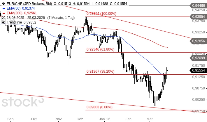 EUR/CHF brach am 27. Januar 2026 aus einer Seitwärtsbewegung, die im August 2024 ihren Anfang genommen hatte, nach unten aus. Anschließend fiel EUR/CHF auf 0,8908 CHF. Seit diesem Tief erholt sich das Währungspaar und brach gestern über den Widerstandsbereich um 0,9137 CHF. Daher kann die Erholung in Richtung 0,9210 CHF oder sogar 0,9235 CHF weitergehen. Danach droht aber ein Abverkauf auf neue Tiefs.