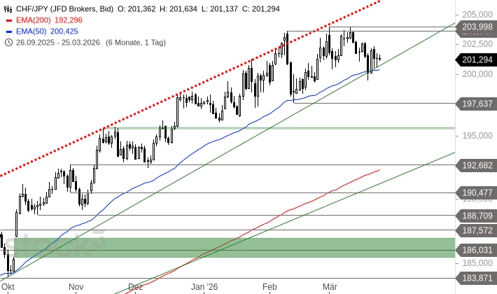 CHF/JPY markierte nach einer längeren Rally am 02 März 2026 ein Hoch bei 203,998 JPY. Seit diesem Hoch konsolidiert das Währungspaar und fiel dabei auf den Aufwärtstrend seit April 2025 zurück. Auf diesem Trend läuft es seit einigen Tagen seitwärts. Sollte sich CHF/JPY von diesem Trend lösen können, dann wäre ein Anstieg bis 203,998 CHF und ca. 206,300 CHF möglich. Ein Rückfall unter 199,478 CHF würde aber Abgaben in Richtung 197,637 und 195,593 CHF andeuten.