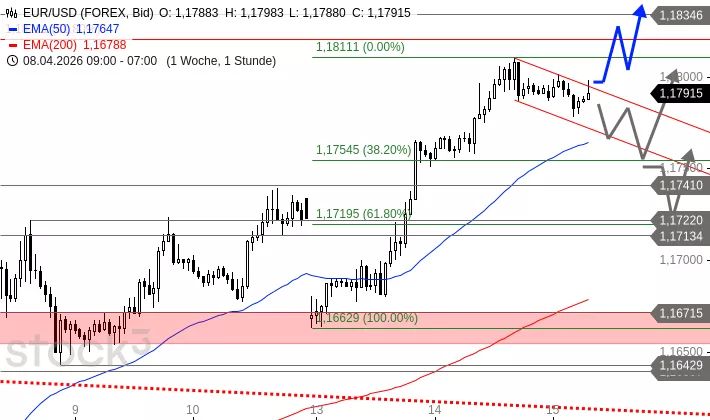 Gelingt der Ausbruch aus der Flagge, kann EUR/USD direkt über die Ziel- und Widerstandszone um 1,1821 bis 1,1835 USD ausbrechen. Ein Anstieg bis 1,1919 bis 1,1925 USD wäre dann möglich. Misslingt der aktuelle Ausbruchsversuch aber, dann müsste mit Abgaben in Richtung 1,1755 USD oder sogar 1,1720 USD gerechnet werden. Aber selbst bei einem Rückfall auf 1,1720 USD wäre die Abwärtsbewegung nur ein Rücksetzer im neuen Aufwärtstrend seit Mitte März.