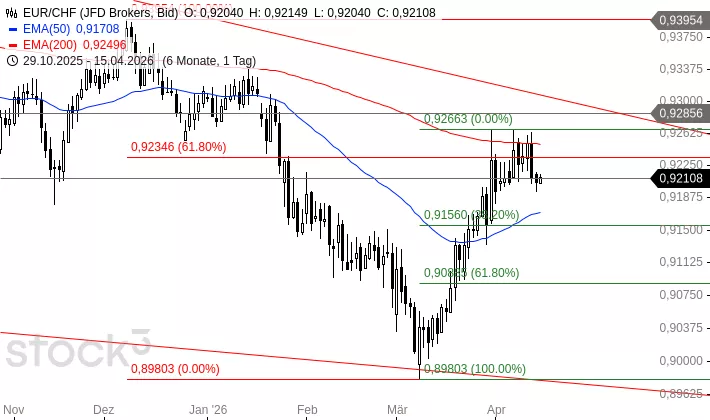 EUR/CHF erholte sich ab 09. März stark und kletterte an den EMA200. Dort läuft das Währungspaar seit 31. März seitwärts und deutet eine Topbildung an. Noch ist diese aber nicht endgültig abgeschlossen. Ein Fall unter das gestrige Tagestief bei 0,9194 CHF wäre aber wohl der Abschluss. Dann müsste mit Abgaben bis 0,9156 und 0,9099 CHF gerechnet werden. Später könnte EUR/CHF sogar unter das Tief vom 09. März fallen. Ein Ausbruch über 0,9266 CHF könnte aber eine weitere Rally in Richtung 0,9395 CHF einleiten.