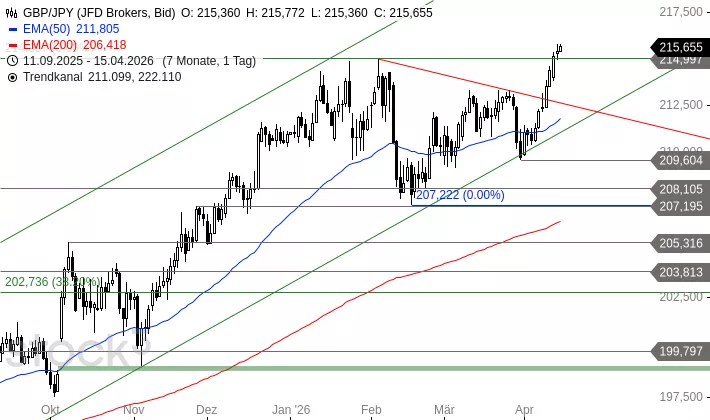 GBP/JPY konsolidierte nach dem Hoch bei 214,997 JPY vom 04. Februar ausführlich. Am 09. April gelang der Ausbruch aus der Konsolidierungsformation. Am Montag folgte der Anstieg auf ein neues Rallyhoch. Seitdem behauptet sich das Währungspaar über dem alten Hoch. GBP/JPY hat damit die Chance auf eine weitere Rally in Richtung 223,823 JPY. Im Falle eines Rückfalls unter 214,997 JPY müsste zwar noch einmal mit einem Rücksetzer auf die Konsolidierungsformation gerechnet werden, aber auch dann läge das nächste große Ziel bei 223,823 JPY.