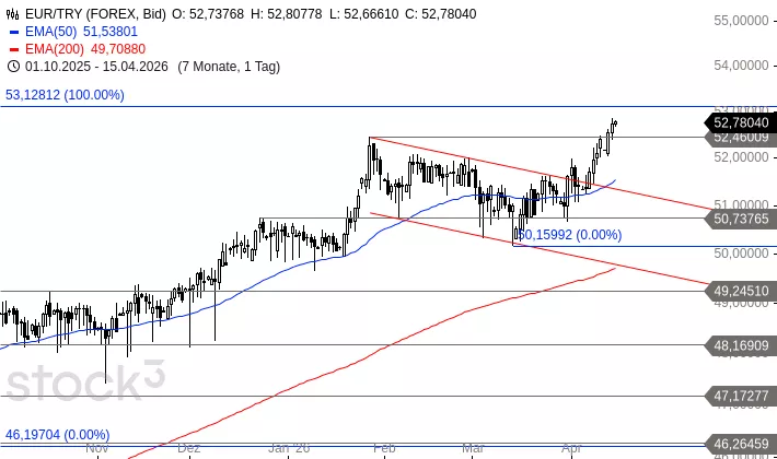 EUR/TRY brach am Montag über das Allzeithoch vom 27. Januar 2026 bei 52,4601 TRY nach oben aus und zieht seitdem weiter an. Diese Aufwärtsbewegung sollte kurzfristig noch zu Gewinnen bis 53,1281 TRY führen. Mittelfristig sind weitere Gewinne in Richtung 56,9602 TRY möglich. Rücksetzer an den EMA50 (Tagesbasis) bei aktuell 51,5380 TRY wären für die Bullen ungefährlich.