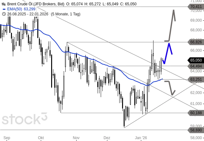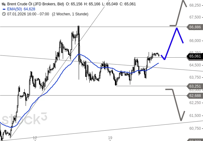 Nach dem starken Anstieg ist ein kurzfristiger Rücksetzer jederzeit möglich. Rückläufe bis in den Bereich um 64,49 USD wären dabei als normaler Pullback zu werten. Solange sich der Kurs oberhalb dieser Zone hält, bleibt die Chance bestehen, die Rally weiter auszudehnen. Auf der Oberseite wäre zunächst ein Anlauf an die Hochs bei 66,88 USD möglich. Erst ein Rückfall unter 63,25 USD würde das Bild wieder eintrüben und Abgaben in Richtung 61,00 USD begünstigen.