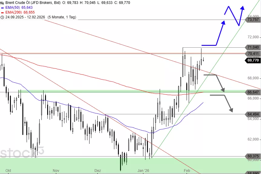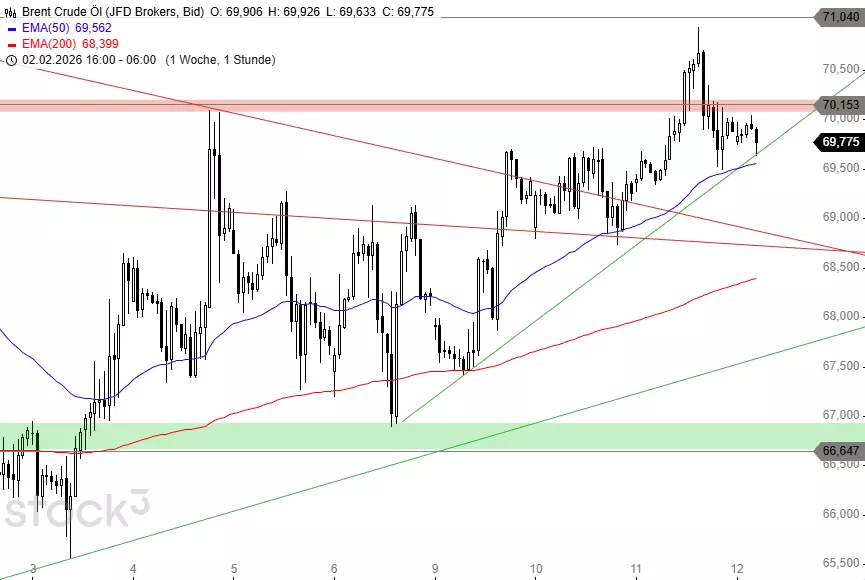 Mit einem Anstieg über 70,41 USD und das Erholungshoch bei 71,04 USD wäre ein kleines Kaufsignal aktiv, dem eine Aufwärtsphase bis an den Widerstand bei 73,75 USD folgen kann. Sollte das Zwischenhoch aus dem Juli 2025 überschritten werden, könnte die Kaufwelle bis 74,70 USD und 79,51 USD führen. Scheitern die Käufer dagegen an der Hürde bei 71,04 USD, wäre ausgehend von 68,50 USD ein weiterer Ausbruchsversuch zu erwarten. Ein Bruch dieser soliden Kreuzunterstützung dürfte den Ölpreis dagegen weiter bis 66,64 USD und 64,49 USD einbrechen lassen.