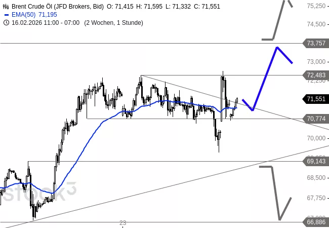 Nach einem deutlichen Rutsch unter die Unterstützung bei 70,77 USD geriet Brent zunächst unter Druck. Der Rücksetzer wurde im Handelsverlauf jedoch zügig aufgefangen. In der Folge drehte der Kurs nach oben und brach auf der Oberseite aus der zuvor ausgebildeten Flaggenstruktur aus. Im Bereich der Hochs bei 72,48 USD setzte jedoch eine spürbare Gegenbewegung ein.