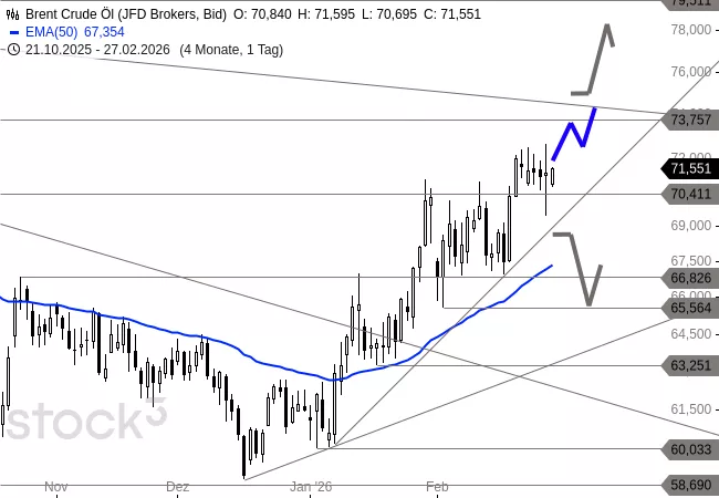 Der Anstieg der Volatilität könnte sich nach dem gestrigen Handelstag fortsetzen. Nachdem sich die Abwärtsbewegung unterhalb von 70,77 USD nicht nachhaltig durchgesetzt hat, könnte die übergeordnete Rally wieder in den Fokus rücken. Solange der mittelfristige Aufwärtstrend verteidigt wird, ist ein Anstieg in Richtung 73,76 USD möglich. Darüber hinaus könnte sich Potenzial bis in den Bereich um 75,00 USD eröffnen. Rutscht Brent jedoch unter 69,14 USD und damit unter den Aufwärtstrend, dürfte sich das charttechnische Bild wieder eintrüben.