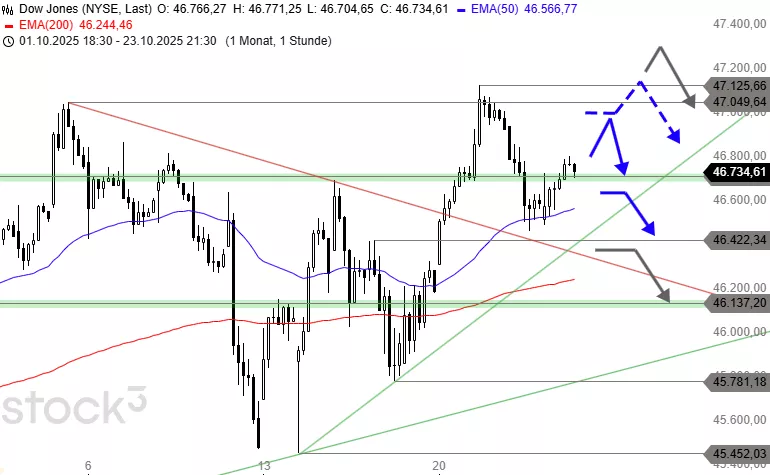 In einem ersten Schritt dürfte der Dow Jones jetzt oberhalb von 46.900 Punkten eröffnen und direkt den Widerstand bei 46.975 Punkten ansteuern. Wird dieser überwunden, könnte auch das Allzeithoch bei 47.125 Punkten sowie später die Zielregion um 47.300 Punkten erreicht werden. Auf beiden Niveaus ist weiterhin mit einer deutlichen Korrektur zu rechnen. Abgaben unter 46.714 Punkte würden den heutigen Kurssprung aber konterkarieren und sofort zu einem Einbruch auf 46.422 Punkte führen. Damit wäre auch ein Verkaufssignal möglich.