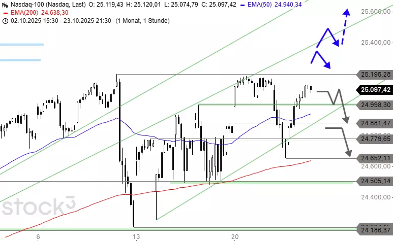 Eine kurze Korrektur im Bereich von 25.350 Punkten wäre nicht ungewöhnlich. Kann sich der Index über diese Marke nach oben schrauben, ist mit weiteren Zugewinnen bis 25.460 Punkten zu rechnen. Darüber wäre sogar die Zone um 25.620 Punkte erreichbar. Prallt der Index dagegen von 25.350 Punkten ab und unter 25.195 Punkte zurück, müsste man im Bereich von 25.050 Punkten auf einen bullischen Konter hoffen. Darunter wäre der Ausbruch gestoppt und letztlich ein Abverkauf in Richtung 24.998 und 24.881 Punkte zu erwarten.