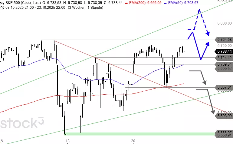 Um die hochvolatile Rally der letzten Tage jetzt erfolgreich fortsetzen zu können, müsste der Index über 6.790 Punkte ansteigen. Damit wäre der Weg bis 6.830 Punkte geebnet. Hier wäre ein weiterer Abverkauf zu erwarten. Fällt der S&P 500 dagegen nach einer bullischen Eröffnung unter das alte Rekordhoch bei 6.764 Punkten zurück, müsste die 6.752-Punkte-Marke verteidigt werden, um Abgaben bis 6.709 und 6.699 Punkte zu verhindern. Darunter stünde ein heftiger Einbruch bis 6.657 und 6.593 Punkte an.