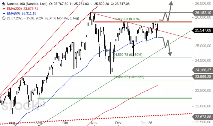 Gelingt dem Nasdaq 100 ein Ausbruch über 25.835 Punkte, dann wäre ein Anstieg in Richtung 26.182 Punkte möglich. Sollte der Index allerdings unter das Gap vom 22. Dezember abfallen, dann würden erneute Abgaben gen 24.592 Punkte drohen. Um 13:58 Uhr wird der Index bei 25.50 Punkten und damit 20 Punkte unter dem gestrigen Schlusskurs getaxt.