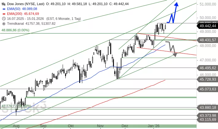 Trotz der gestrigen Verluste hat der Dow Jones noch immer Chancen auf einen schnellen Ausbruch über das Rekordhoch. Anschließend könnte der Index bis an die obere Begrenzung der Rally seit Juni 2025 ansteigen. Die verläuft heute bei 49.696 Punkten. Sollte der Index allerdings unter 48.431 Punkte abfallen, könnte es zu einer Ausdehnung der Konsolidierung seit dem Allzeithoch kommen. In diesem Fall wäre mit einem Rücksetzer gen 47.655 Punkte zu rechnen.