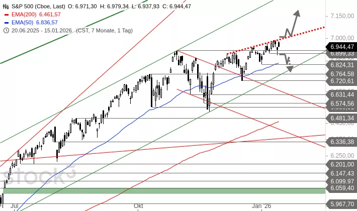 Der S&P 500 konnte gestern aus seinem Ausbruch vom 24. Dezember über das bis dahin gültige Allzeithoch bei 6.920 Punkten nicht profitieren und fiel wieder unter dieses Hoch zurück. Allerdings zeigte sich nach dem Rückfall kein Abgabedruck. Der Index bildete gestern eine kleine Unsicherheitskerze aus. um 14:13 Uhr wird der Index bei 6.903 Punkten und damit minimal im Minus getaxt.