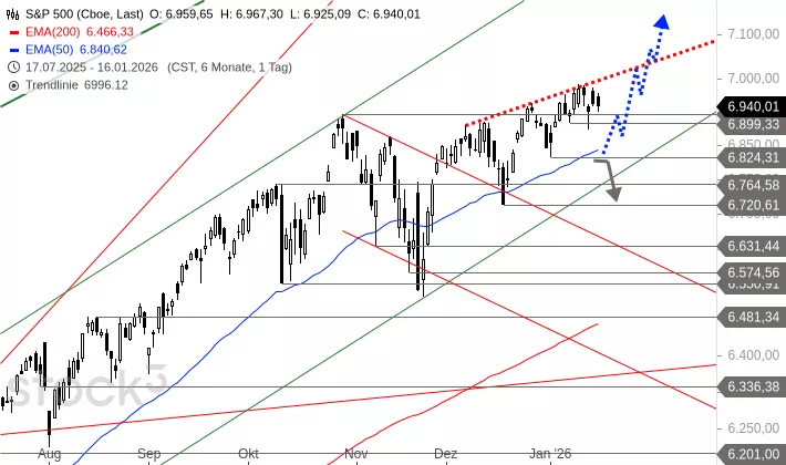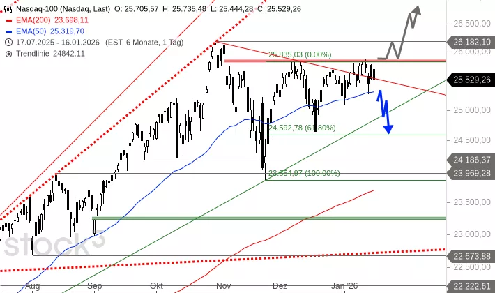 Der Dow Jones scheiterte am Freitag am Widerstandsbereich um 49.621/633 Punkte und damit an seinem Allzeithoch. Er befindet sich noch immer in einer Konsolidierung, die nach dem Hoch vom 7. Januar eingesetzt hat und sich bisher im Wesentlichen oberhalb des alten Allzeithochs bei 48.886 Punkten abspielt. Allerdings wird der Index um 13:17 Uhr bei 48.695 Punkten und damit 665 Punkte unter seinem Schlusskurs vom Freitag getaxt.