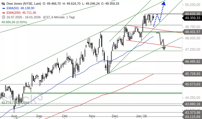 Der Dow Jones würde mit einer Eröffnung auf diesem Niveau zwar unter das alte Rekordhoch zurückfallen, die Oberkante einer bullischen Flagge ab 12. Dezember bei heute 48.607 Punkten aber noch halten. Dreht der Index im Bereich dieser Oberkante nach oben, dann wäre noch immer eine Rally bis ca. 50.220 und 51.335 Punkte möglich. Ein Rückfall unter 48.433 Punkte würde allerdings auf Abgaben in Richtung 47.182 Punkte hindeuten.