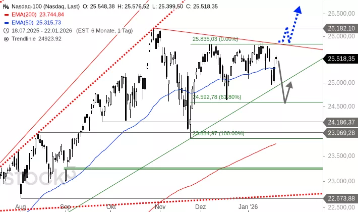 Der Nasdaq 100 korrigiert seit seinem Allzeithoch vom 29. Oktober 2025 in einer mehrmonatigen Konsolidierungsphase. Während das bisherige Tief bei 23.854 Punkten liegt, bildet die Marke von 25.835 Punkten die obere Grenze. Ein drohender Rückfall am Dienstag wurde am Mittwoch postwendend gekontert, als der Index über den EMA50 auf Tagesbasis zurückkehrte. Damit wurde eine potenzielle neue Abwärtswelle innerhalb des Korrekturtrends zunächst unterbunden und die charttechnische Lage stabilisiert.