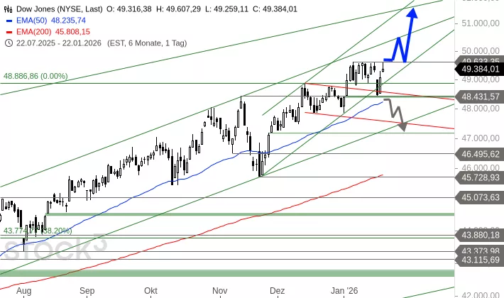 Ein prozyklisches Kaufsignal entsteht erst bei einem Ausbruch über 49.633 Punkte. In diesem Szenario lägen die nächsten Ziele an den oberen Pullbacklinien bei 50.301 und später 51.402 Punkten. Kritisch würde es hingegen, wenn der Index unter die Marke von 48.431 Punkten rutschen würde. Ein solcher Rückfall würde das positive Momentum beenden und weitere Kursverluste in Richtung der 47.182-Punkte-Marke nach sich ziehen.