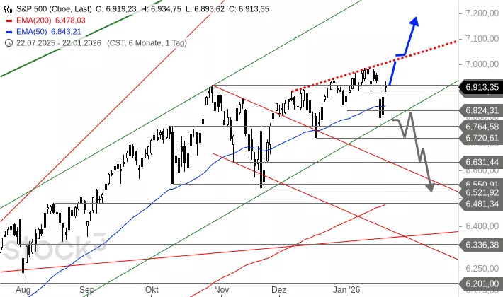 Der S&P 500 bewegt sich aktuell in einer kurzfristigen Konsolidierung innerhalb eines intakten Aufwärtstrends, wobei die Dynamik spürbar nachlässt. Gestern verteidigte der Index mit einer kleinen Unsicherheitskerze das Kursniveau am alten Allzeithoch aus dem Oktober bei 6.920 Punkten. Obwohl die bullische Flagge bereits Ende November nach oben aufgelöst wurde und seitdem mehrfach neue Höchststände erreicht wurden, verhindert eine obere Pullbacklinie bei aktuell 7.010 Punkten einen stärkeren Durchmarsch.