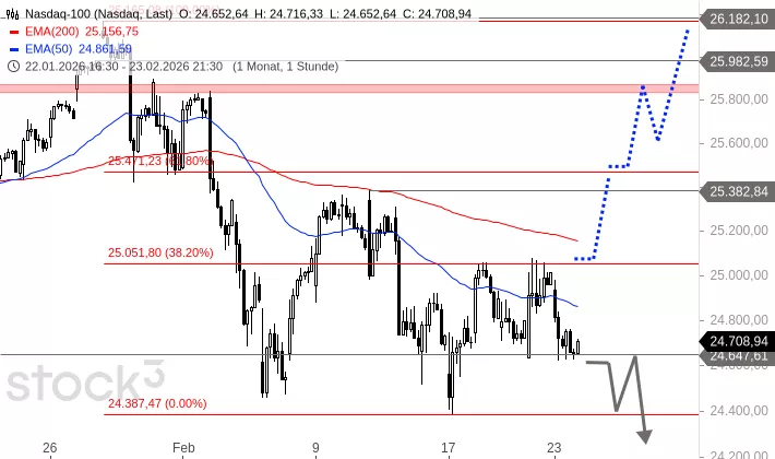 Der Nasdaq 100 verharrt seit seinem Allzeithoch vom Oktober 2025 bei 26.182 Punkten in einer Seitwärtsbewegung, deren untere Begrenzung durch das Tief aus dem November 2025 bei 23.854 Punkten markiert wird. Am 28. Januar prallte der Index am Rekordhoch ab und fiel in der Folge bis auf die Marke von 24.387 Punkten zurück. In der anschließenden Erholungsphase scheiterte der Nasdaq 100 jedoch gleich zweimal an einem kurzfristigen logarithmischen 38,2 %-Retracement bei 25.051 Punkten. Positiv zu werten ist immerhin, dass die Unterstützung bei 24.647 Punkten bisher Halt bot.