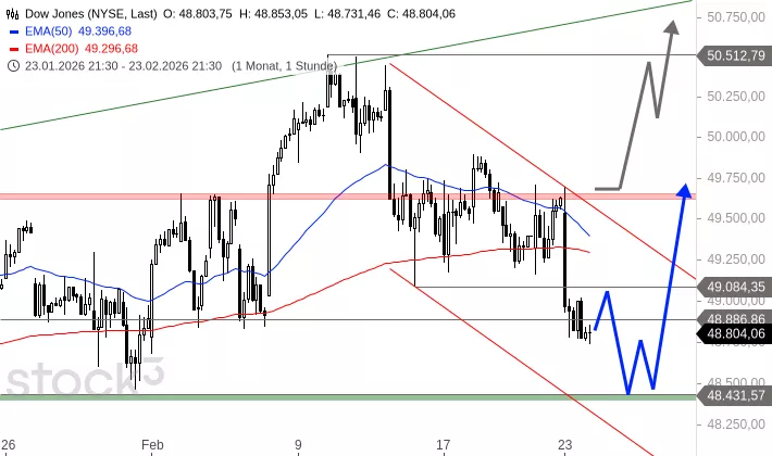 Obwohl die kurzfristige Abwärtsdynamik gestern bestätigt wurde, liegen innerhalb des intakten Aufwärtstrends bisher keine größeren Verkaufssignale vor. Solange der Index unter 49.084 Punkten notiert, bleibt ein Rückfall in Richtung 48.431 Punkte das wahrscheinlichere Szenario. Dort bestünde jedoch eine gute Chance auf eine Bodenbildung und eine anschließende Rally auf neue Rekordstände. Ein vorzeitiges Kaufsignal würde erst ein stabiler Ausbruch über 49.621 Punkte generieren, was aktuell jedoch noch ein gutes Stück entfernt liegt.
