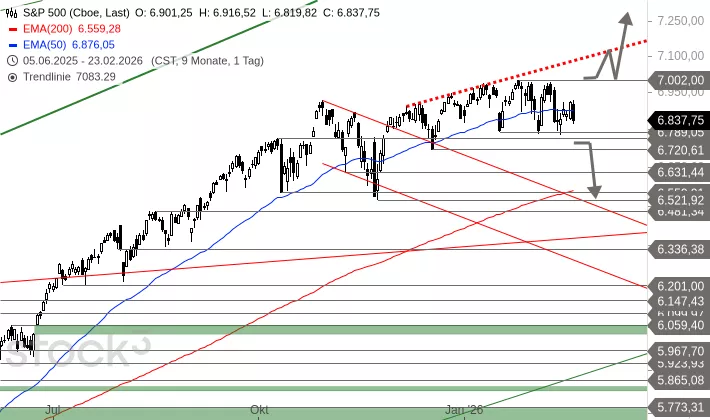 Der S&P 500 ist seit Mitte Januar 2026 in einer Seitwärtsbewegung gefangen. Die Oberseite wird durch eine Widerstandszone zwischen 6.985 und 7.002 Punkten begrenzt, während die Unterseite durch den Bereich von 6.789 bis 6.764 Punkten abgesichert wird. Im gestrigen Handel scheiterte der Index bereits früh an einem kurzfristigen logarithmischen 61,8 %-Retracement bei 6.909 Punkten und korrigierte daraufhin bis auf die Marke von 6.819 Punkten. Nach diesem Rücksetzer ging der S&P 500 in eine mehrstündige Seitwärtsphase über.