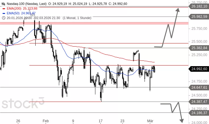Der Nasdaq 100 befindet sich seit seinem Allzeithoch bei 26.182 Punkten in einer breiten Range zwischen diesem Hoch und dem Tief aus dem November 2025 bei 23.854 Punkten. Innerhalb dieser Range hat sich zuletzt eine kleinere Range entwickelt, die zwischen 24.387 und 25.382 Punkten verläuft. Mit den aktuellen Taxen um 14:00 Uhr fällt der Index zwar unter die Unterstützung bei 24.647 Punkten, die gestern Halt geboten hat, aber die Marke bei 24.387 Punkten bleibt intakt.