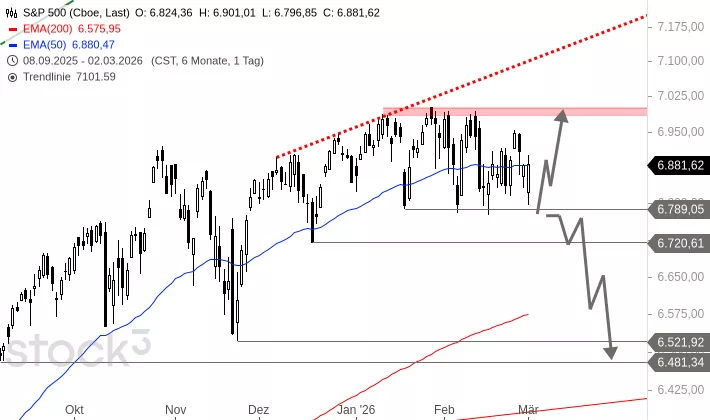 Der S&P 500 befindet sich seit Mitte Januar 2026 in einer Seitwärtsbewegung zwischen dem Widerstandsbereich um 6.985 bis 7.002 Punkte und der Unterstützungszone um 6.789 Punkte. Diese Unterstützungszone hat der Index zweimal minimal gebrochen, er fiel dabei auf 6.775 Punkte zurück. Exakt dort wird kurz nach 14:00 Uhr getaxt. Somit ist die Seitwärtsbewegung gerade noch so intakt.