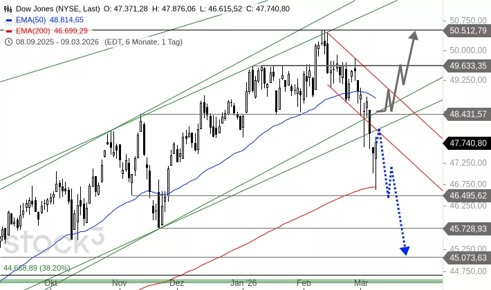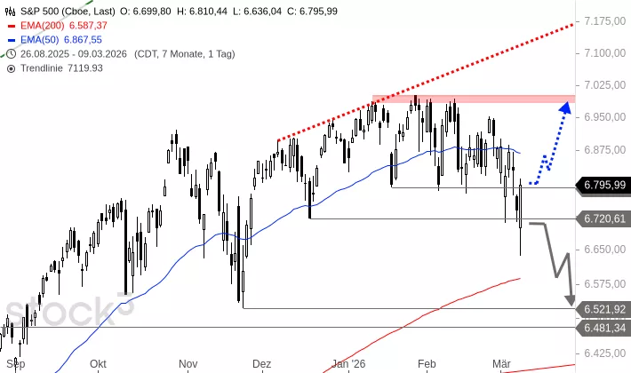 Der S&P 500 bildete nach dem Hoch im Januar 2026 eine Seitwärtsbewegung zwischen der Widerstandszone bei 6.985 bis 7.002 Punkten und der Unterstützung bei 6.789 Punkten aus. Am Dienstag und Freitag fiel er unter die untere Begrenzung, verteidigte aber die Notfallunterstützung bei 6.720 Punkten. Um 9:11 Uhr wird der Index bei 6.636 Punkten deutlich unter dieser Notfallunterstützung getaxt.
