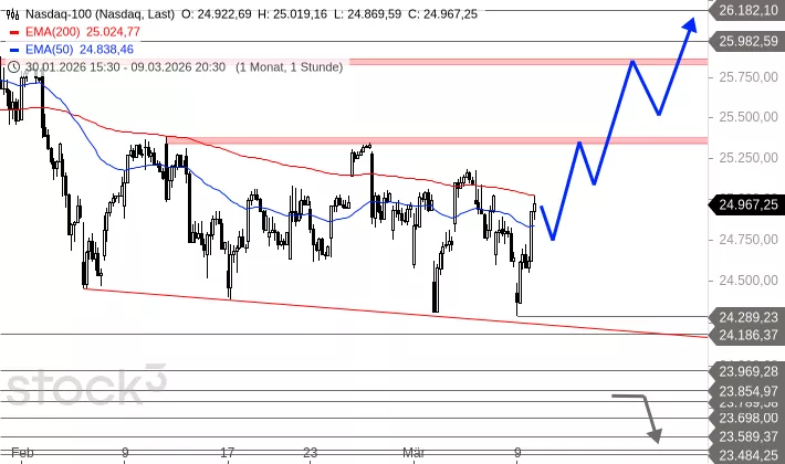 Der Nasdaq 100 eröffnete am Freitag schwach und fiel unter den Unterstützungsbereich um 24.647 Punkte. Die Erholung auf 24.886 Punkte wurde in der zweiten Tageshälfte wieder abverkauft. Um 13:16 Uhr wird der Index bei 24.410 Punkten und damit deutlich über den Tiefs aus der Nacht getaxt. Die kurzfristige Abwärtsbewegung innerhalb der Seitwärtsbewegung ist intakt. Die Seitwärtsbewegung spielt sich zwischen 26.182 und 23.854 Punkten ab.