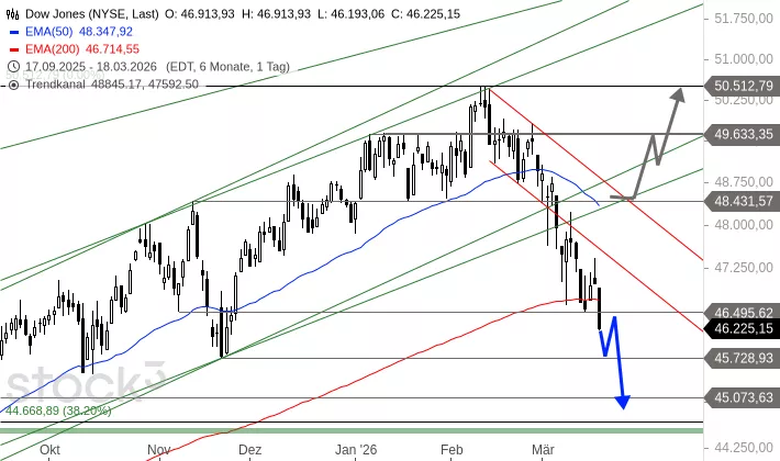Kurzfristig bestimmen Risiken das Bild, da ein Durchbruch nach unten bis auf die Zone zwischen 45.073 und 44.668 Punkte führen kann. Dort wäre eine Bodenbildung möglich, sollten Käufer aktiv werden. Ein vorzeitiges Kaufsignal ist derzeit allerdings unwahrscheinlich. Erst ein Ausbruch über 48.431 Punkte würde einen Trendwechsel signalisieren. Bis dahin bleiben weitere Abgaben oder volatile Bewegungen wahrscheinlich, da Unsicherheiten und Zurückhaltung prägend für das aktuelle Handelsgeschehen im Dow Jones sind.