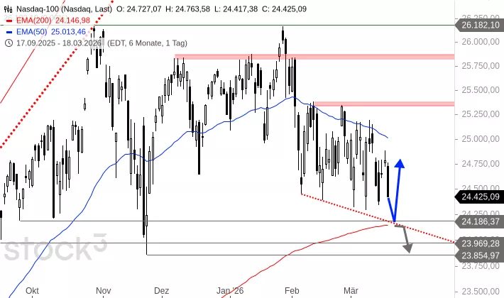 Besonders die Unterstützung bei 24.186 Punkten rückt heute in den Fokus. Von dort aus könnte eine Gegenbewegung starten. Bleibt eine Erholung aus, droht ein Rückfall auf 23.854 Punkte und damit ein Test der unteren Begrenzung der Range.