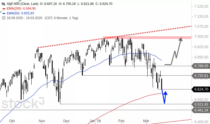 Der S&P 500 markierte gestern ein neues Tief in der laufenden Korrektur, konnte sich aber zum Schlusskurs minimal über der Marke von 6.623 Punkten behaupten. Der Versuch, die Hürde bei 6.720 Punkten zu überwinden, blieb zu Wochenbeginn erfolglos. Diese Situation lässt das kurzfristige Chartbild angespannt erscheinen. Rutschende Kurse könnten den Index auf das wichtige Verlaufstief aus dem November 2025 bei 6.521 Punkten drücken. Dort entscheidet sich der mittelfristige Kursverlauf.